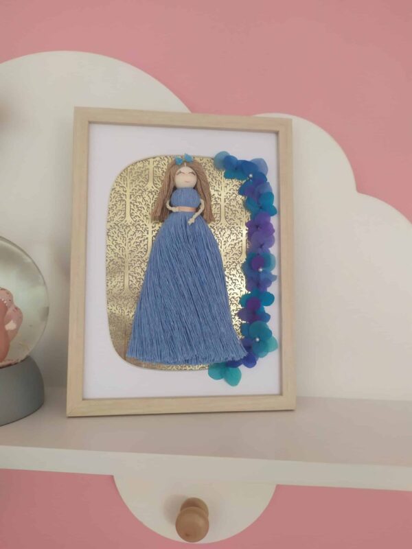 Le cadre met en scène une adorable petite fille aux cheveux châtains clairs vêtue d’une belle robe longue bleue, symbolisant l’innocence et la créativité. Son design délicat et ses détails soignés apportent une touche artisanale unique à votre décoration.